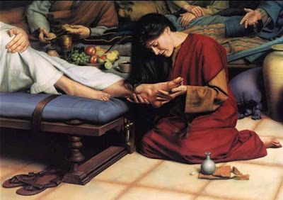 36 When one of the Pharisees invited Jesus to have dinner with him, he went to the Pharisee’s house and reclined at the table. 37 A woman in that town who lived a sinful life learned that Jesus was eating at the Pharisee’s house, so she came there with an alabaster jar of perfume. 38 As she stood behind him at his feet weeping, she began to wet his feet with her tears. Then she wiped them with her hair, kissed them and poured perfume on them.